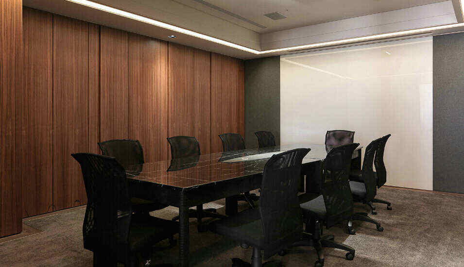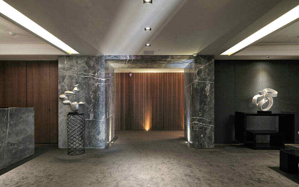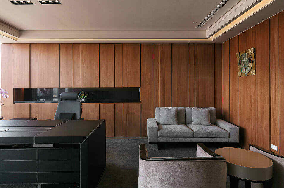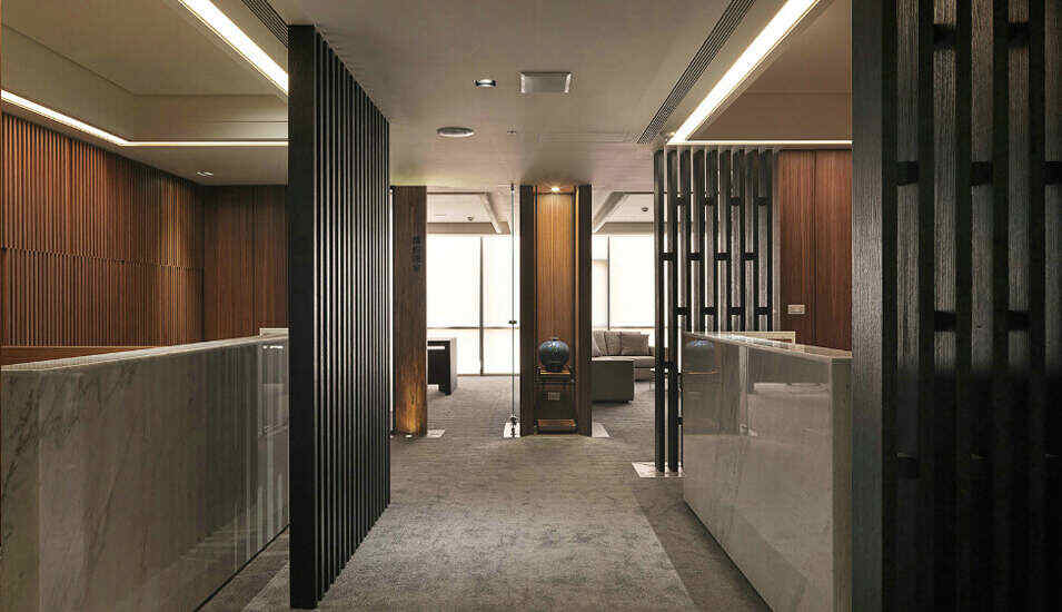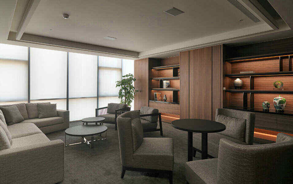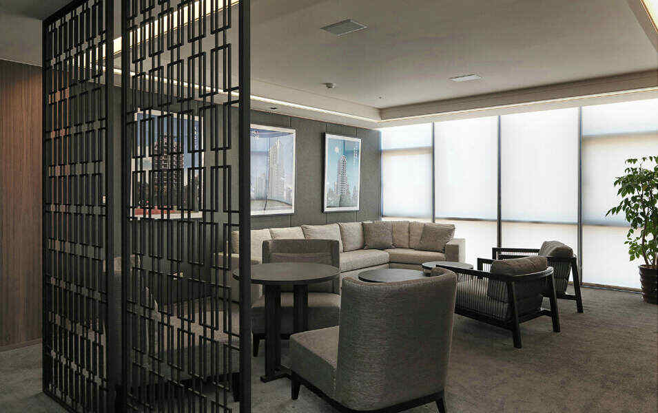 设计介绍:上海融儒投资有限公司装修案例以灰色为主,黑色的座椅,典雅,复古的墙砖铺设,简约靓丽的吊灯配饰,舒适优雅,屏风阻隔,办公室内物质美学原理与古朴中式意蕴互相糅合更有中国风儒雅,凝重现代气质。