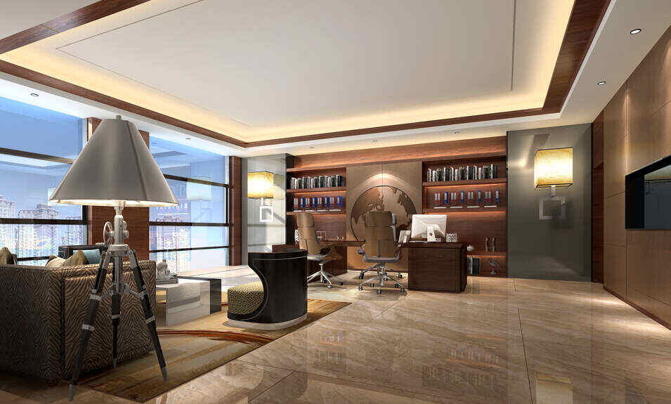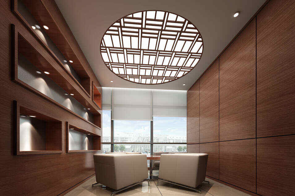 设计介绍:现代简约凝重风如何展现?设计师们运用棕色的色调表现出凝重感,顶部圆形中国风网状带有悠久的中国艺术,天圆地方设计,使人一进入到这个办公室给人与专业、理性的感觉,这点特别符合公司的企业文化。