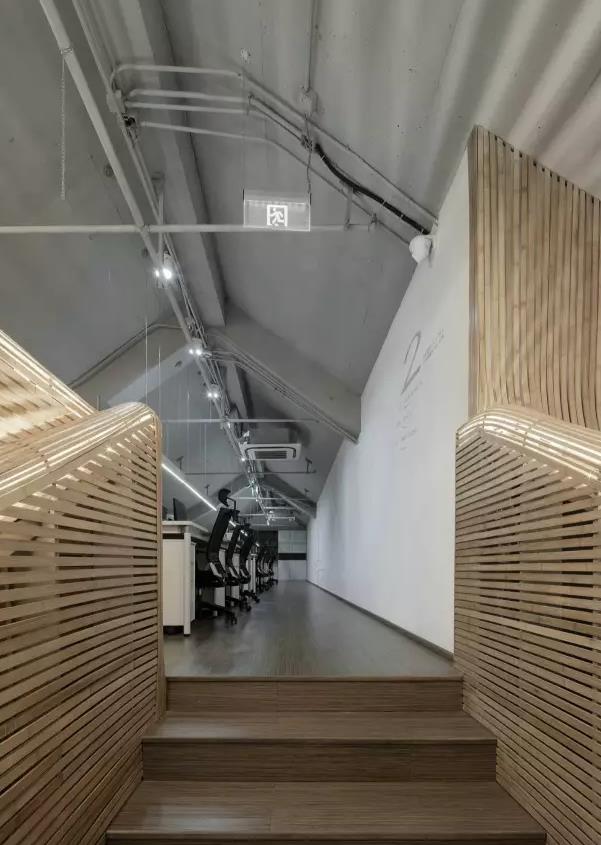高端文化传媒办公室设计:将竹子的元素运用在这里,并还原其本身的色彩。艺术必须出自于大自然,因为大自然已为人们创造出较独特美丽的造型。而竹子作为一种建筑材料代表了古代亚洲建筑体系的内涵, 而中国它的产量是足够支撑装饰材料的消耗的,并且有着高韧性、可塑性强的特点。在连接顶层的楼梯部分,我们没有再让竹子继续沿用直线语素。顶面部分做曲线拼接,延续而上。
