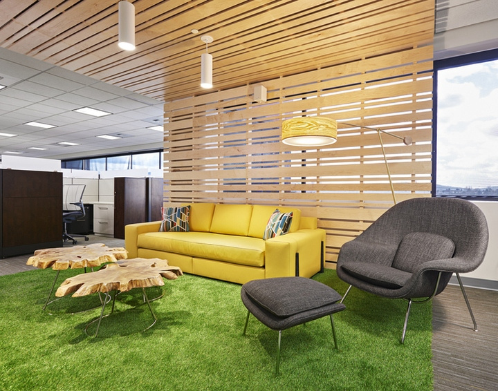 在办公空间设计时就要将有机、自然的理念融入办公室装修设计,在满足功能使用的情况下,尽量减少独立隔断间,让空间更加开敞流通,打造促进员工协作的开放式动态空间;再者增加了办公空间装饰的丰富性,绿色植物搭配点缀,让企业更加有生机。