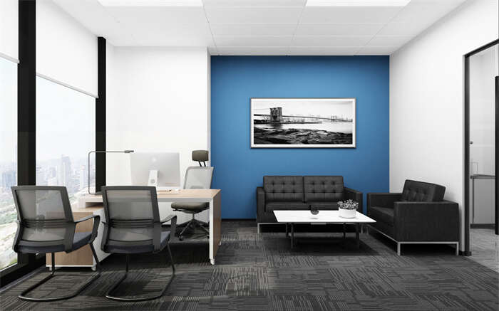 在办公室设计装修时,无论是墙面、天花亦或是地面、家具、立面装饰,这些物体的配色和使用都会使空间产生对比,从而可以提高空间感。那么如何使用墙面、天花、亦或是地面、家具、立面装饰的配色使空间产生对比呢?那么首先对于墙面、天花及地面,一般来讲天花使用灰色系无彩色,也就是浅灰色,墙面使用白色可以极大地提升空间的延伸感。而有一些墙面如会议室或者会议区的电视背景墙则可以使用有彩色或灰色与周边白色墙面形成对比,一方面点缀了空间不让其那么单调,另一方面使用颜色对比空间使空间感觉更加宽敞。而对于地面、家具和墙面装饰,首先家具要尽量使用同等规格的工位有序且承区域排放使空间看起来更加整齐。因为杂乱的空间不仅使人心烦意乱,而且会使空间看上去无序且拥挤。而整齐的空间使人赏心悦目,心胸开阔且工作效率提升。地面要和家具色彩相反若使用深色地面,则宜采用浅色家具,若使用浅色底面则使用深色家具起到稳定重心的作用,使得空间不至于轻浮或者过重。至于墙面装饰则可以使用烤漆写字板,一方面增加功能性形成一片功能区域,另一方面写字板烤漆反光也可以作为空间的折射延伸。