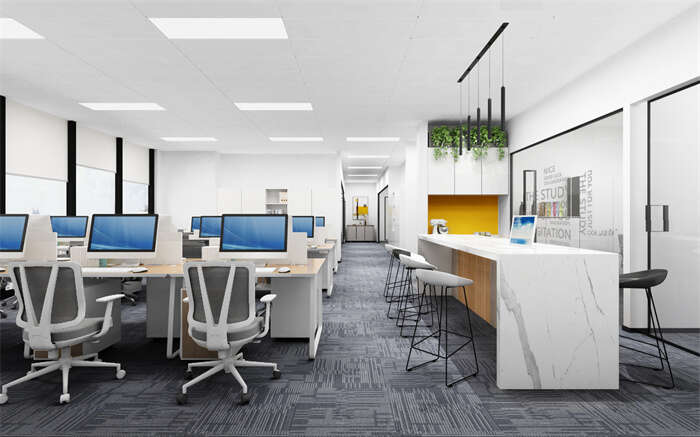 另一方面因为员工对于光线的遮挡会使室内采光减弱,这样空间就会看上去相对阴暗狭小。所以工位尽量侧边靠窗,使员工能够侧面面光,一方面提升了员工舒适度,另一方面因为办公区之间的过道,光线不会被遮挡,室内采光会更好,从而使空间敞亮,空间感提升。然而又到了不得不说的光线不足的时候,此时我们需要用到灯具进行采光,为了避免占用地面和桌面空间,应尽量减少使用落地灯和桌面灯光,转而使用平板吊线灯或者是筒灯,这样不仅光照度更强,而且也节约了成本。