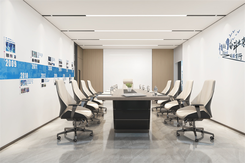 其次是会议室及洽谈室这一类的独立功能性区域,不仅需要考虑功能性照明,也许需要将空间的氛围体现出来。比如使用内嵌的线条灯和在其两边布置射灯突出会议室严肃的气氛;使用线条灯和筒灯做一些造型用来使洽谈室和茶水室气氛活跃;