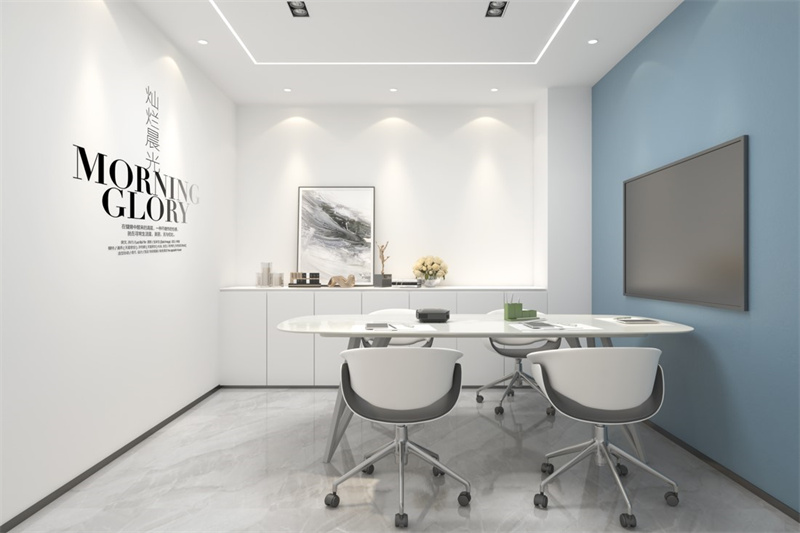 墙面单层涂料:墙面涂料大多是指乳胶漆,在办公室装修中是使用最广的一种,其施工简单、易于调色、造价便宜,能够使办公室产生整体感,且突出空间明亮、宽敞,是被大众广泛接受且使用的办公室装修设计材料。但因为其装饰性较低、变化不多的局限性,所以在进行办公室装修时,可以选择在墙面上做一些挂画装饰,并配以射灯。墙面素雅、灯光点缀,在光线映照的柔和阴影里,可以提升办公室的简约舒适感。