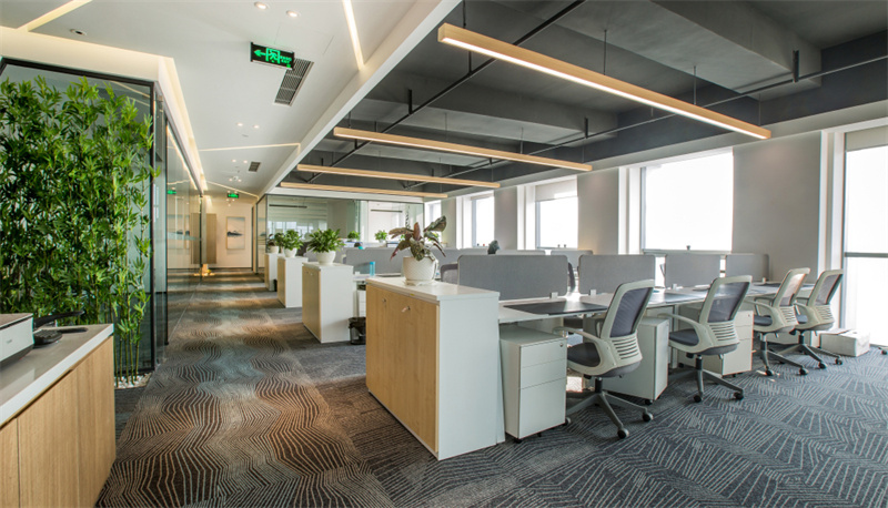 2、活动隔断常用的分为:屏风隔断、植物隔断、矮柜隔断。屏风隔断用在酒店、中式风格办公室居多,因其特点是小巧轻便,可以随意移动,彰显出公司的文化底蕴,营造一个文雅、恬静的办公环境。植物隔断与矮柜隔断可以相结合,植物能提升办公室的生机活力,而矮柜则还有收纳功能,文件物品都能放在这,不会让空间沉闷压抑。