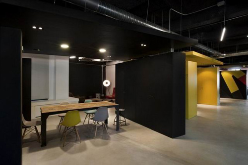 这套工业风办公楼设计采用了大量的黑色工业风元素不仅顶面是黑色工业的吊顶而且隔断墙也都采用了黑色工业风格,为了缓解办公空间压抑气氛,办公室装修公司设计师采用了一些亮色的家具打破沉闷的气氛,员工休息室也以明亮活力多彩为主,办公室黑色隔墙墙是员工的充满艺术感的抽象画作,整个办公室空间很强的工业风,地面是做的环氧地坪地面。